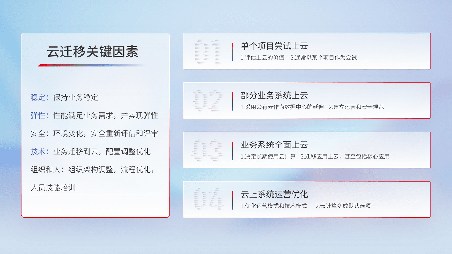 结合实际业务,,,,从规划设计、、、云平台选型、、、、云原生改造、、、、数据迁移、、、、集成交付,,,,迁移全过程为客户识别最佳上云路径,,,,做好风险识别管理,,设计网络架构、、、、身份权限、、安全审计合规、、操作审计、、日志审计、、监控告警策略、、多站点容灾设计等,,,对云上基础设施进行整体规划,,提升IT治理水平,,,,以满足弹性、、高可用、、高性能的需求。。