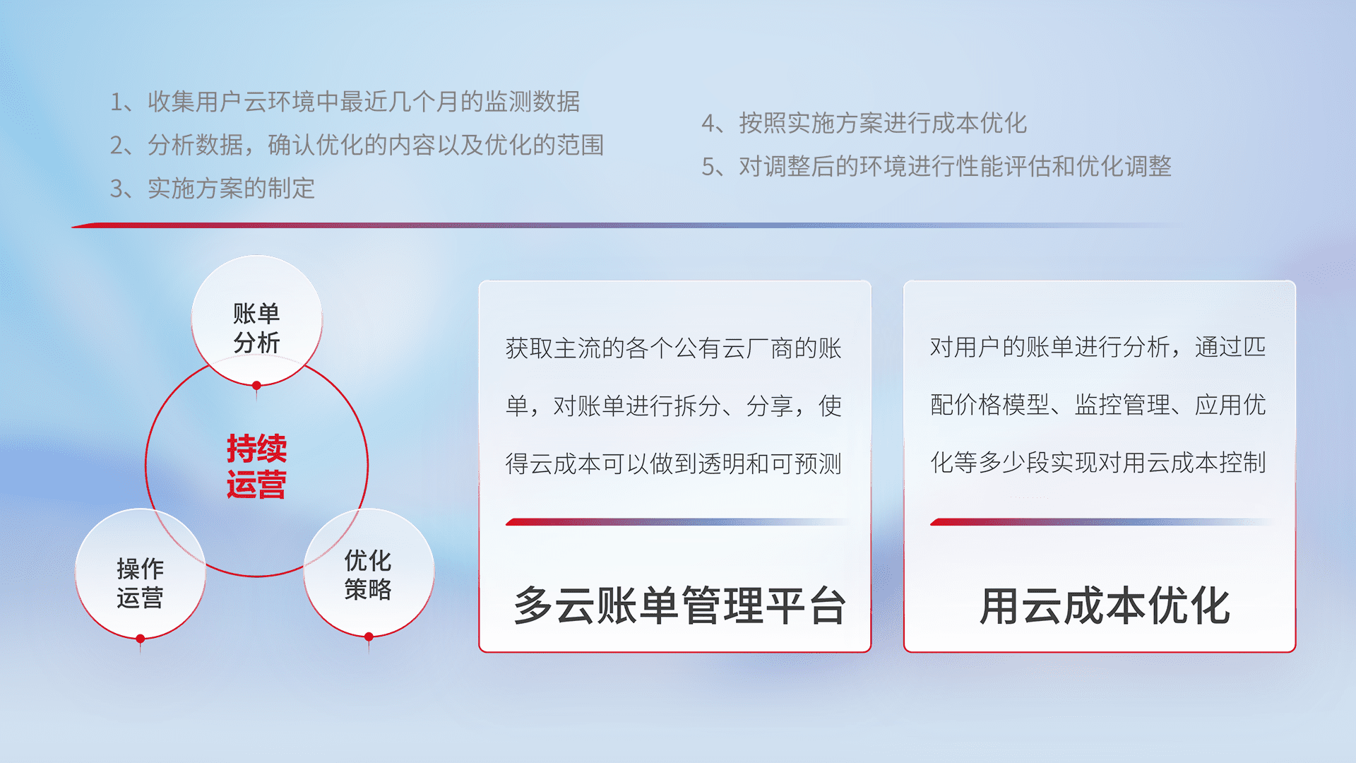 通过多云纳管,,,以统一的资源数据模型把客户的云资源进行抽象和封装,,进而实现对多云资源的统一操作,,保障云资源管理的可靠性、、稳定性与可用性。。量身定制化运维内容,,配置、、、开发运维、、、、补丁管理、、、、备份、、、、监控、、、认证和访问管理、、审计和日常巡检等,,保障在用云过程中的可靠度,,,,稳定度以及高可用率。。